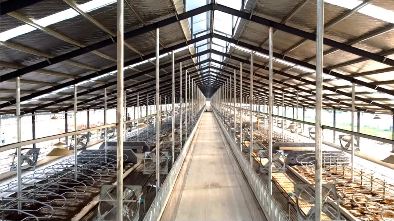 在37度高温下,走进智慧牧场,猛然感到一阵凉爽,只见一排排可自动调节转速的风扇正在“卖力工作”,一排排崭新的淋浴器这在往吃草的奶牛身上均匀喷水。不一会,吃饱喝足的奶牛开始躺到舒适的卧床上“打盹”,卧床通道里不见粪污堆积,空气中弥漫着奶牛饲料的清香。